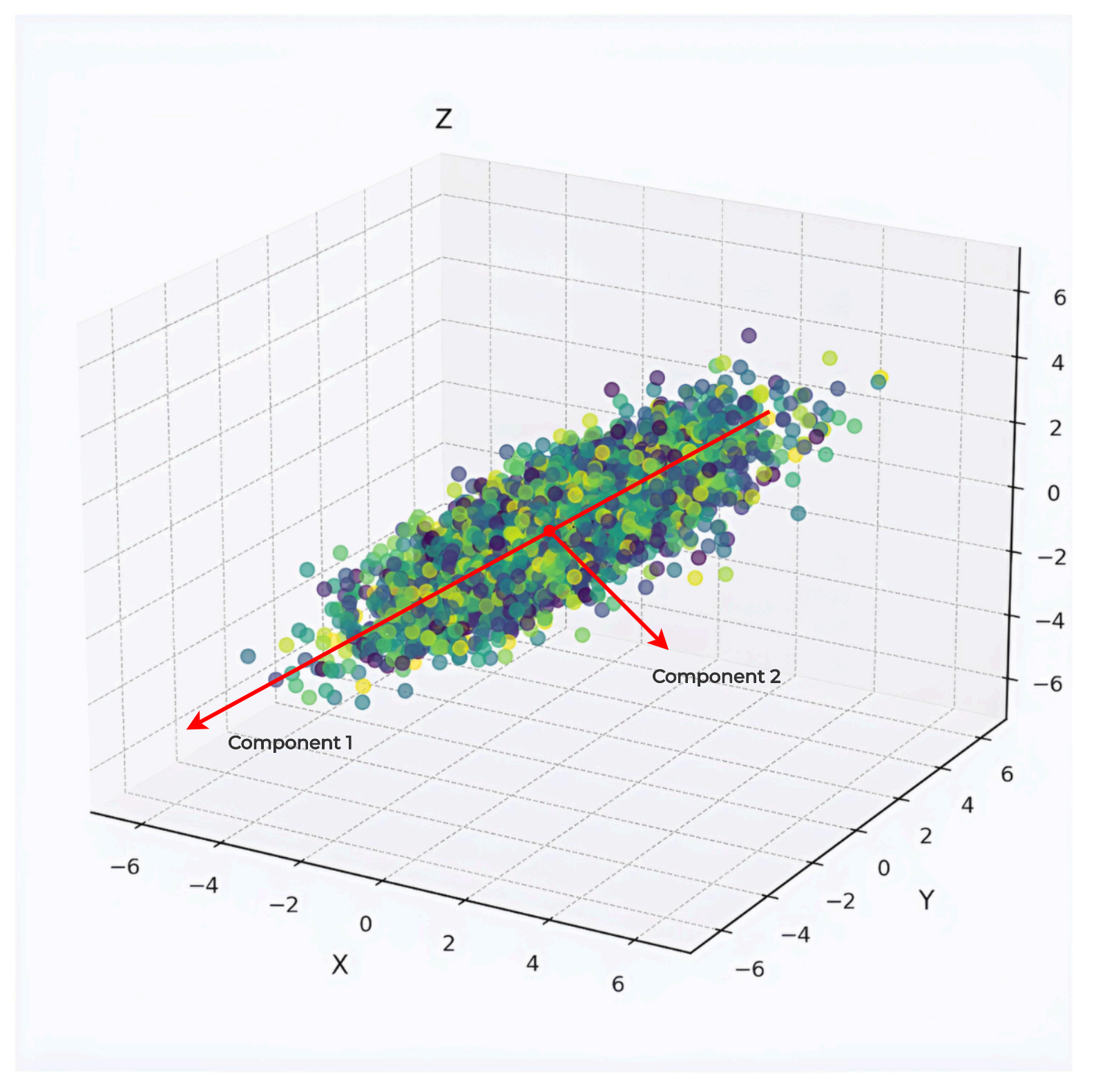 Principal Component Analysis (PCA) rests on linear algebra, transforming a dataset into a new coordinate system by leveraging the covariance structure of its features. For a dataset with \( n \) observations and \( p \) features, represented as a matrix \( X \in \mathbb{R}^{n \times p} \), PCA computes principal components as directions that maximize variance. This process involves a series of well-defined steps, grounded in matrix operations and eigenvalue decomposition.