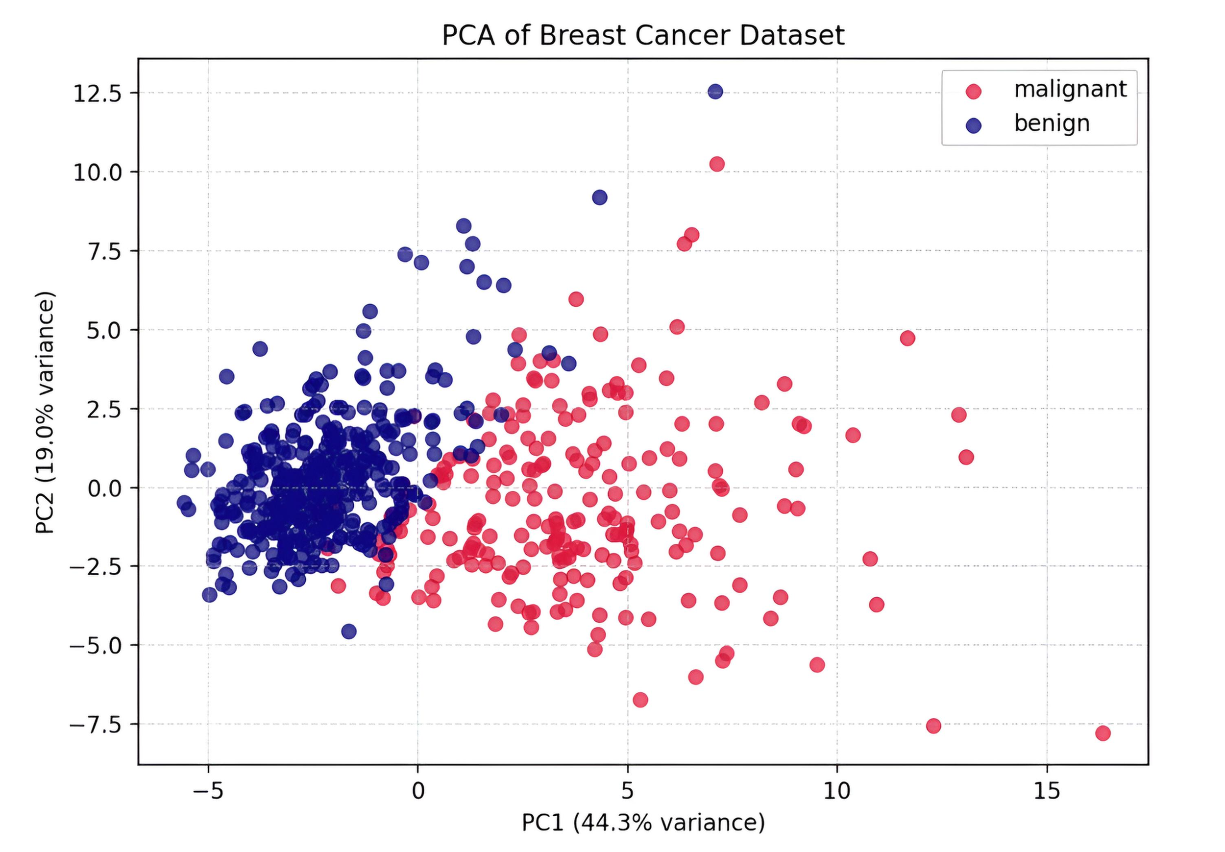 The plot shows the Breast Cancer dataset reduced from 30 features to two principal components. PC1 explains 44.3% of the variance and PC2 adds 19.0%, together capturing over 63% of the dataset’s variability. The separation between malignant (red) and benign (blue) samples is clear along PC1, demonstrating how PCA reveals underlying structure and provides a compact, interpretable view of high-dimensional medical data.