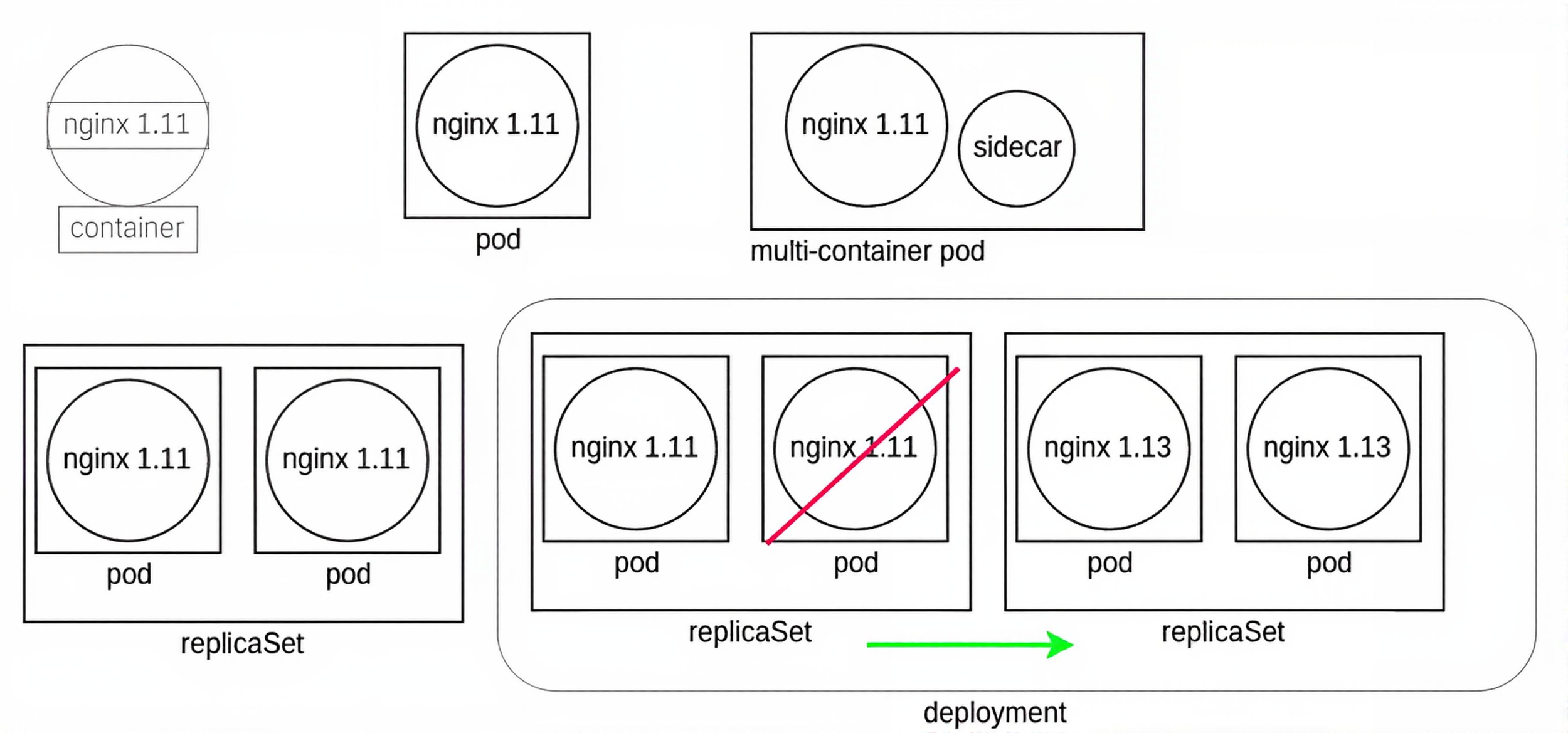 The graphic in the lower right shows a Deployment. This controller allows us to manage the versions of images deployed in the Pods. Should an edit be made to the Deployment, a new ReplicaSet is created, which will deploy Pods using the new PodSpec. The Deployment will then direct the old ReplicaSet to shut down Pods as the new ReplicaSet Pods become available. Once the old Pods are all terminated, the Deployment terminates the old ReplicaSet and the Deployment returns to having only one ReplicaSet running.