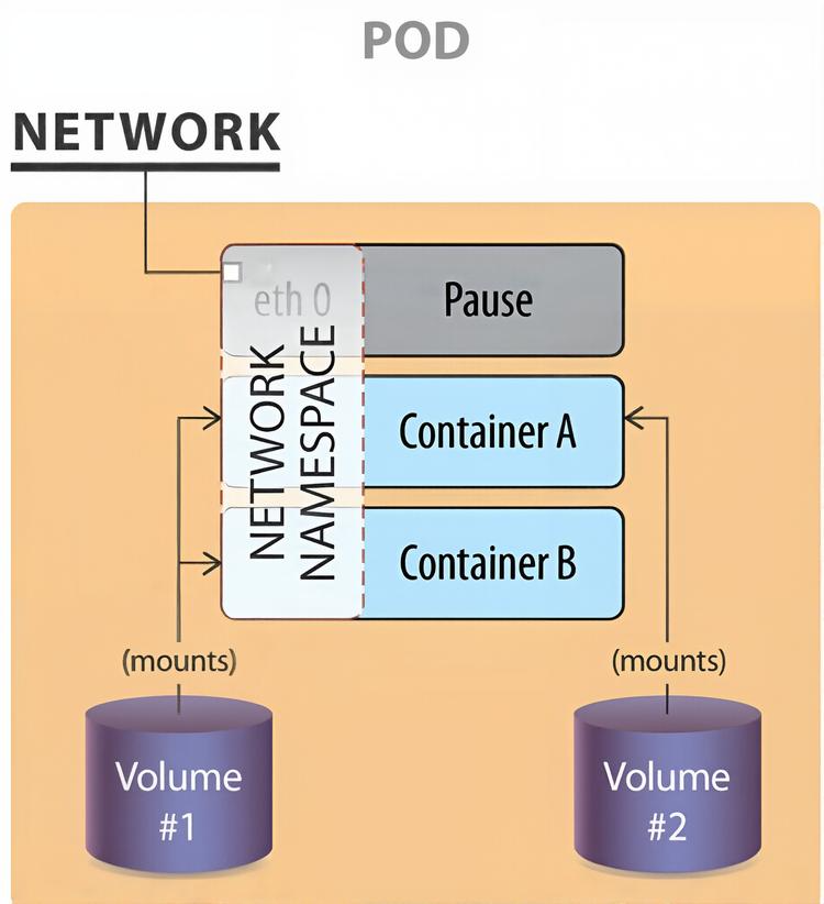 The graphic shows a pod with two containers, A and B, and two data volumes, 1 and 2. Containers A and B share the network namespace of a third container, known as the pause container. The pause container is used to get an IP address, then all the containers in the pod will use its network namespace. Volumes 1 and 2 are shown for completeness.