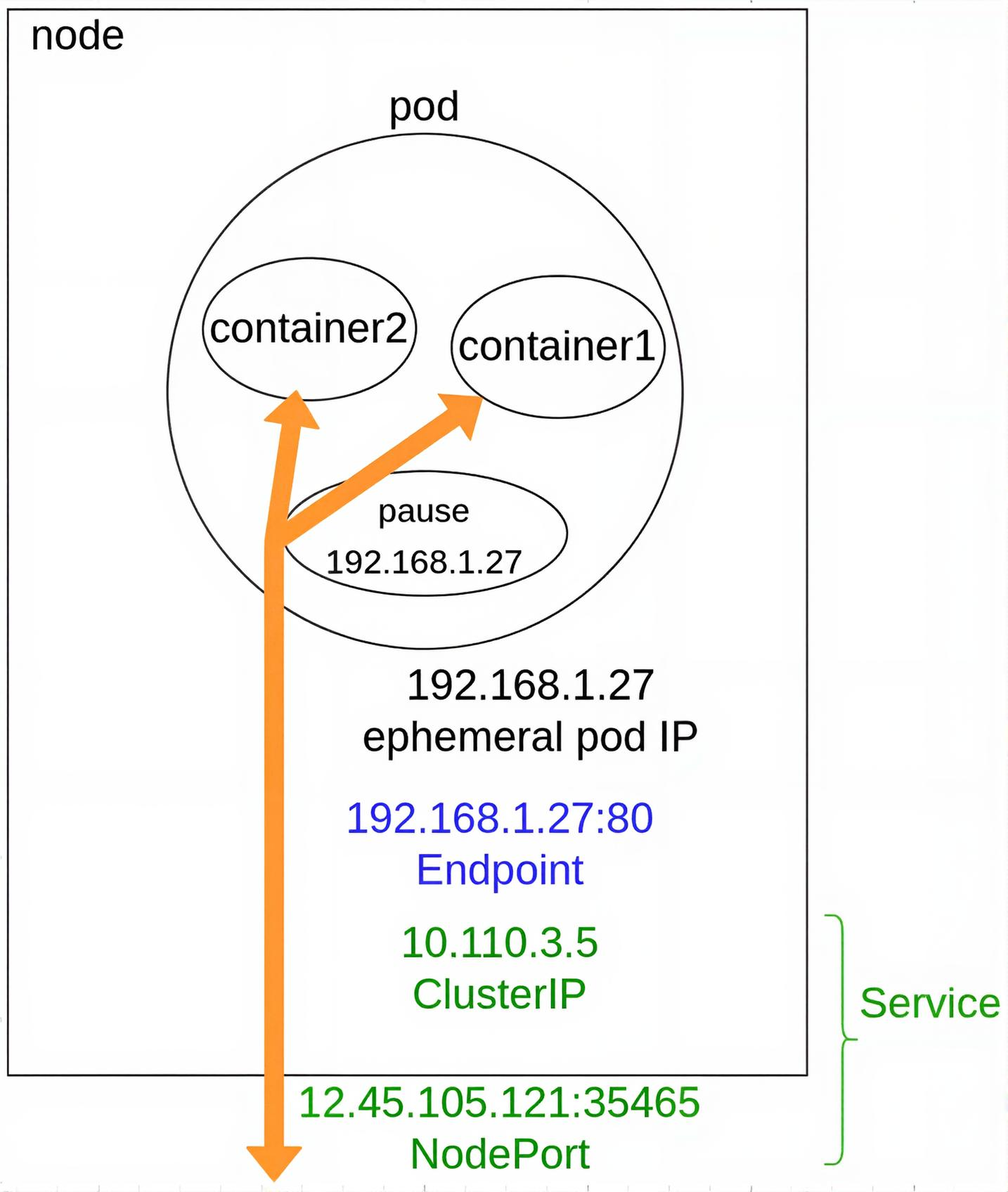 As shown in the diagram, a single, dual-container Pod connects to the outside network through a configured port. This enables external access to the Pod via its shared namespace. Kube-proxy plays a crucial role by routing incoming traffic to the Pod’s IP address, ensuring that external requests reach the correct containers within the Pod. It leverages CNI plugins to manage this process effectively.