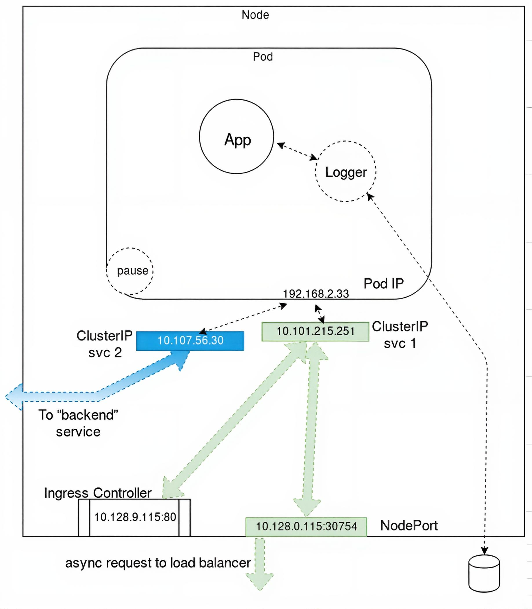 Within the Pod, the primary container and sidecar communicate through the shared network namespace, using mechanisms like loopback interfaces or inter-process communication (IPC). For example, a Logger sidecar can collect logs from the App container without additional network overhead. This setup ensures efficient intra-Pod communication while the pause container maintains the external-facing IP, enabling seamless interaction with the cluster’s network infrastructure.